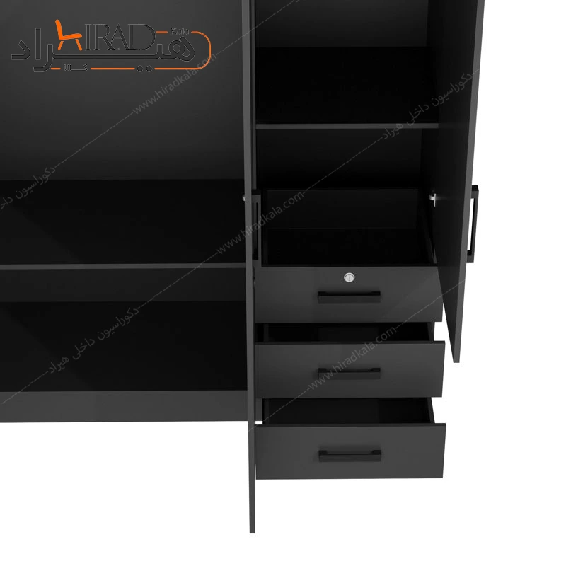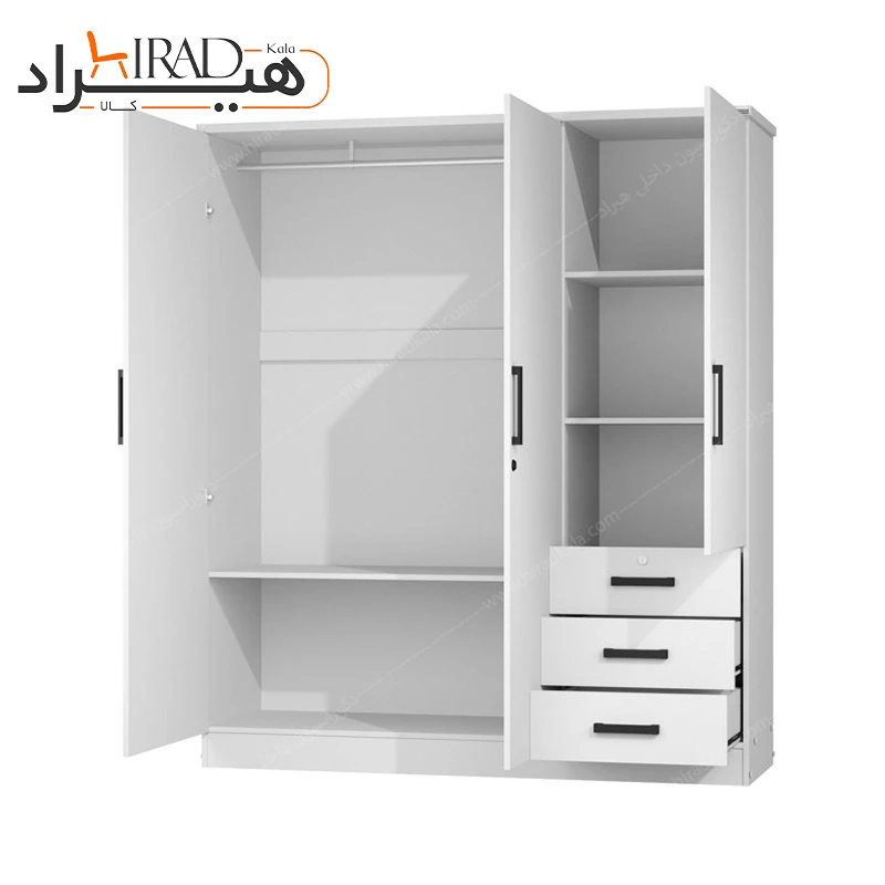 ابعاد استاندارد این کمد باعث میشود بهراحتی در هر فضایی جای گیرد. وجود آویز لباس، کشو، کمد و قفسههای دربدار نیز فضای کافی برای مرتبسازی لوازم شخصی و لباسها فراهم میکند.