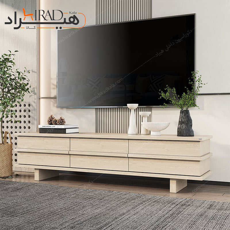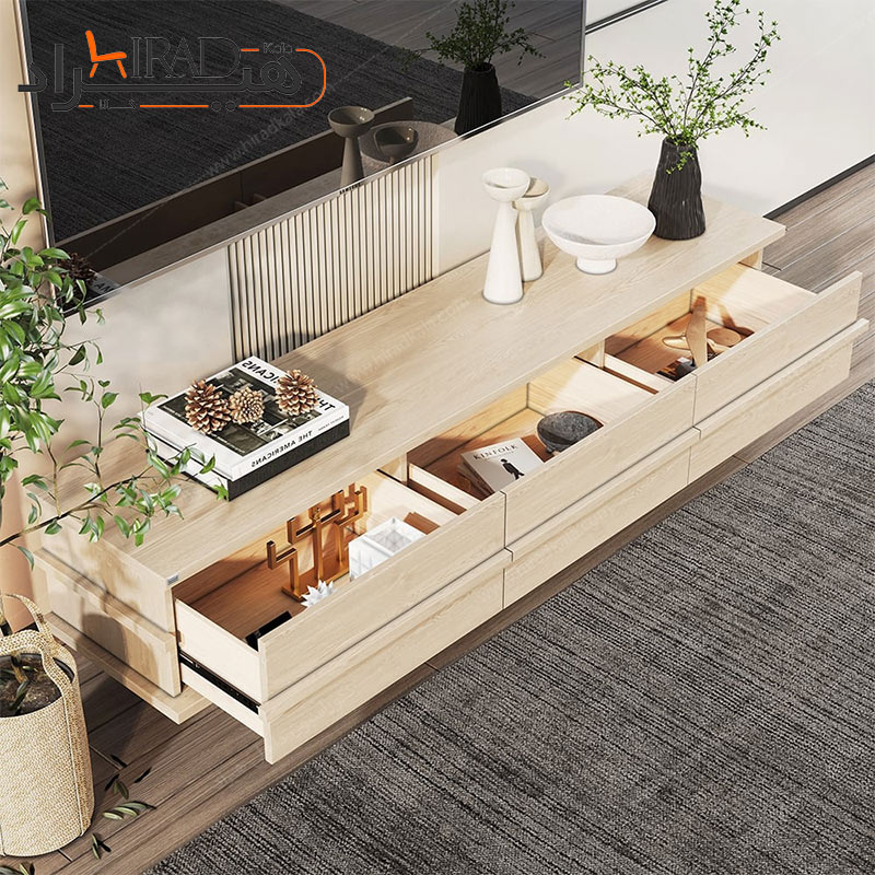 کشوهای کشیده، عمیق و جادار این مدل، فضای کافی برای نگهداری وسایل مختلف از جمله لوازم جانبی تلویزیون، کتاب یا وسایل تزئینی را فراهم میکنند. همچنین ابعاد آن بهگونهای طراحی شده که برای تلویزیونهایی با سایزهای متنوع کاملاً مناسب باشد.